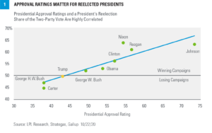 Not surprisingly, approval ratings can play a large part in forecasting the overall percentage of the votes in an election. Only two presidents have lost reelections since the Great Depression: George H. W. Bush and Jimmy Carter. Not surprisingly, both had low approval ratings leading up to the elections. If the people don’t approve of the job you’re doing, you may not serve a second term.