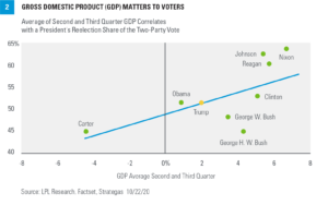 - Gross domestic product (GDP) is set for a huge surge in the third quarter, with the Atlanta Federal Reserve GDPNow estimating a jump of 35.3% when the number is released October 29. That would be the largest quarter-over-quarter increase ever and would bring the average for the previous two quarters to a respectable 2.1%. That’s not bad considering GDP was down more than 31% in the second quarter of 2020. Using regression from previous elections, a 2.1% GDP print comes out to 51.9% of the two-party vote, exactly what President Barack Obama received in 2012 [Figure 2]. Note that the only president who had negative-GDP growth ahead of the election was Carter, who lost his reelection bid in 1980.