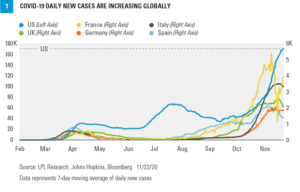 Just as the economic recovery was beginning to gain some steam, COVID-19 cases have been rising dramatically in several regions around the world [FIGURE 1]. The change of seasons is adding to concerns, as colder weather shifts more activities indoors—increasing the chances of viral transmissions. This has prompted many governments to take greater action to try to curb the spread of COVID-19. Several countries and many states in the United States have rolled back reopening plans and implemented new restrictions such as school closures, nighttime curfews, and even stay-at-home orders.