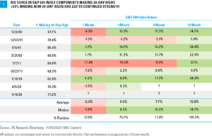 In fact, nearly every measure of breadth and participation we monitor shows a similar trend. Looking at longer-term indicators, 90% of the stocks in the S&P 500 are above their respective 200-day moving averages—a common method of identifying stocks in uptrends. Readings above 85% have signaled above-average forward returns over the next 6 and 12 months.