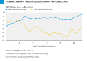 The election outcome was also contested in 1960 with legal challenges in several states; however, the challenge wasn’t strong enough to rattle markets, which shows the bar may be fairly high for any dispute to have a market impact. Even in the 2000 election, the catalyst for the market declines isn’t completely clear, as the election took place in the early stages of the bear market that followed the tech bubble, and that may have contributed to equity weakness.
