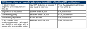 You can contribute to a traditional IRA for 2021 if you had taxable compensation. However, if you or your spouse were covered by an employer-sponsored retirement plan in 2021, then your ability to deduct your contributions may be limited or eliminated, depending on your filing status and modified adjusted gross income (MAGI). (See table below.) Even if you can’t make a deductible contribution to a traditional IRA, you can always make a nondeductible (after-tax) contribution, regardless of your income level. However, if you’re eligible to contribute to a Roth IRA, in most cases you’ll be better off making nondeductible contributions to a Roth, rather than making them to a traditional IRA.
