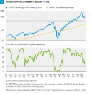 During the COVID-19 pandemic, technology has played a curious role in mitigating downside during bouts of volatility, while also posting considerable outperformance when markets rebounded, as many viewed the sector as relatively well insulated from the economic effects of the virus. After a “melt-up” environment for tech during the month of August, the sector so far has corrected more than 12% from its prior high in September, a historically weak month for the S&P 500. Investors are asking if the weakness will continue.