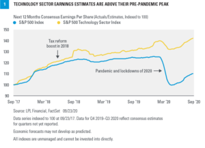 We would first point out how strong fundamentals are right now. Earnings estimates for the sector have already moved above their pre-pandemic highs. While there is risk that these expectations may not be achieved, the gap between technology sector earnings and earnings from the entire S&P 500—which includes technology—is impressive [Figure 1].