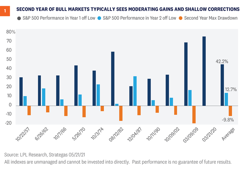 After a nearly 90% rally off the March 2020 lows, it’s not much of a surprise that since mid-April the S&P 500 Index has been choppy and generally moved sideways. Consider that the 1982 and 2009 bull markets both suffered from some fatigue several months into their second years, providing a useful historical analogue. With the U.S. economy picking up speed as the end of the pandemic likely approaches, the economic cycle is maturing. The pickup in inflation and related concerns about the Federal Reserve (Fed) pulling back support offer evidence of an economic cycle getting a bit older. Older cycles tend to bring more moderate stock market gains. Although no one would argue that this cycle looks like any other we have experienced in modern history, studying the second year of historical bull markets—as we also did in our Outlook 2021—can be instructive. Looking back at all of the bull markets since 1950, the average S&P 500 gain during the second year has been about 13% [Figure 1]. With stocks already up about 7% since March 23, 2021, following this pattern would allow for about 6% upside over the next 10 months. However, when focusing on bull markets that followed 30% or greater declines, as the current one did, the average gain during the second year has actually been 17%. Achieving that return would put the index above the high end of our year-end S&P 500 target range of 4,400 to 4,450. We can also look at pullbacks (5-10% decline) and corrections (10-20% decline) during the second years of historical bull markets for a guide to the type of volatility the stock market might experience over the next six to nine months. As shown in [Figure 1], the average maximum drawdown for the index during those years has been about 10%. In the second year of the 2009 bull market, the index corrected about 17%. Given the fast pace of the reopening and the amount of stimulus spending still working its way through the economy, we would expect drawdowns to be average, if not less, as the bull market moves closer to its third birthday on March 23, 2022. Inflation that proves more intense and longer lasting than the Fed expects, which could drive interest rates sharply higher, ranks at the top of potential causes of a correction in the second half of 2021 or early in 2022.