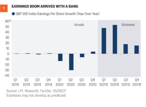 It’s embarrassing to admit this but in our earnings season preview on April 12, when the consensus estimate reflected a nearly 24% increase, we wrote that S&P 500 Index earnings growth for the first quarter could potentially exceed 30%. Fast forward to today and earnings growth for the quarter is on pace to double—yes, double—that 24% growth rate, which would mark one of the biggest upside surprises ever recorded. Here we look at how corporate America produced such a blowout earnings season and what it could mean for the outlook.