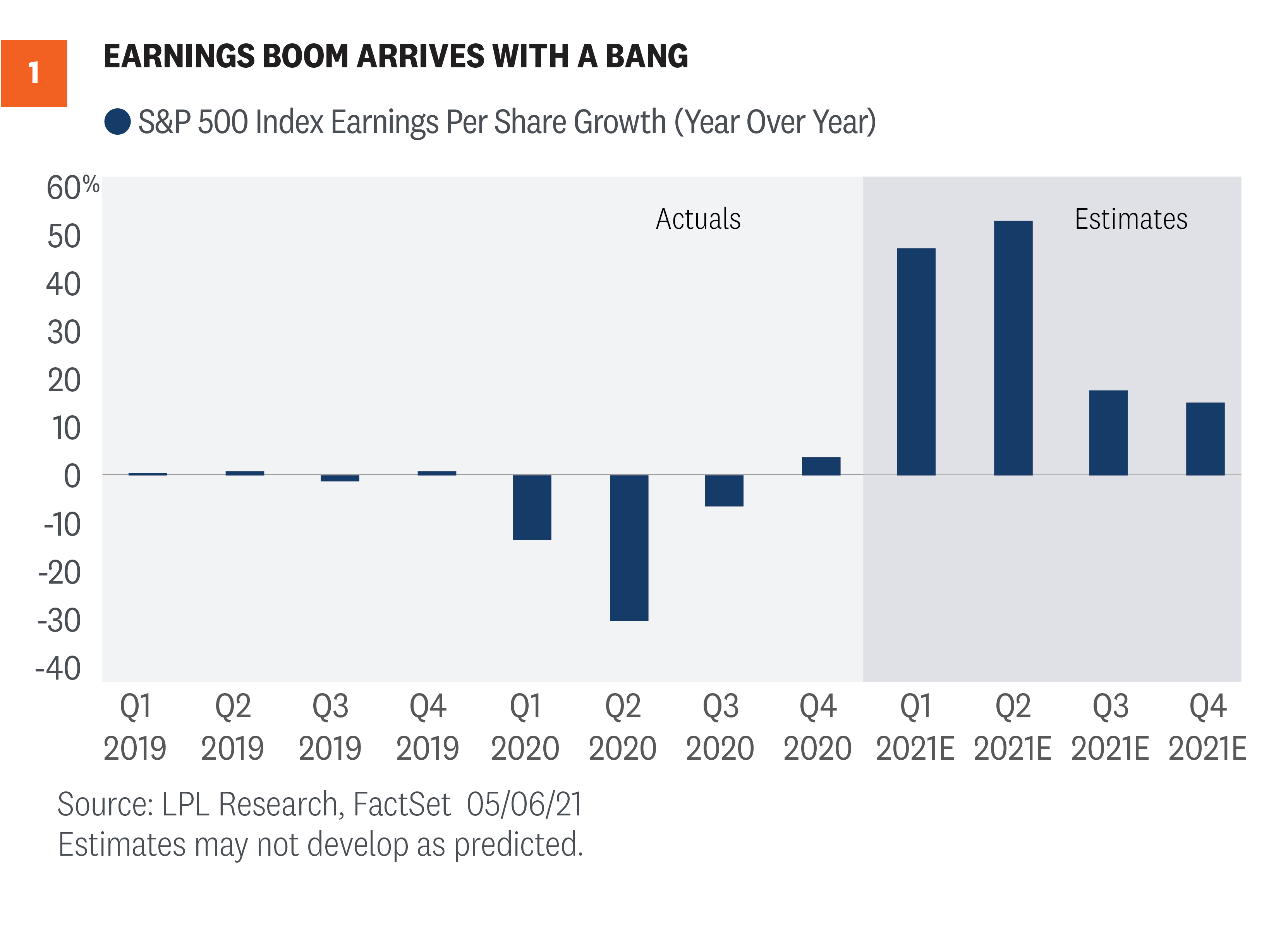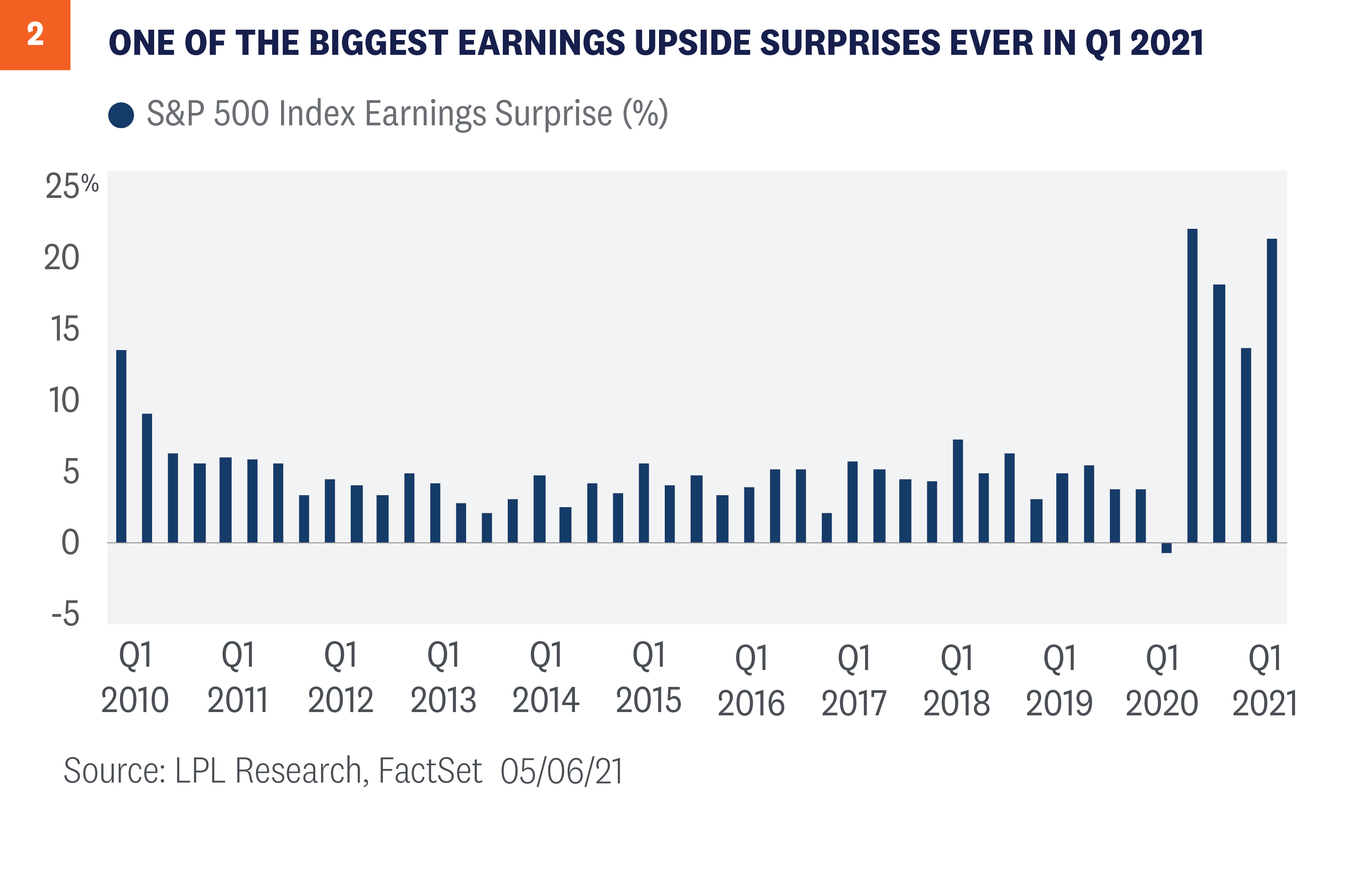 First-quarter earnings were truly remarkable. In fact, results and guidance were so good that we were left with little choice but to lift our earnings forecasts just a month after our last increase. The economic backdrop remains favorable, supported by vaccine distribution, the reopening, and massive stimulus. The stronger earnings growth has enabled stocks to grow into their valuations. As a result, we are raising our 2021 year-end S&P 500 fair value target range to 4,400 – 4,450, which is 4% above the May 7 close at the low end of the range. We acknowledge there are risks to that higher forecast, including COVID-19 spread outside the U.S., deficit spending, geopolitics, inflation, and tax increases. Though justified by low interest rates, stock valuations are elevated. After a nearly 90% rally off the March 2020 lows, the S&P 500 may be due for a pause. So, while our outlook for stocks remains positive, we believe returns over the balance of the year may be modest and come with more volatility. Read previous editions of Weekly Market Commentary on lpl.com at News & Media. Jeffrey Buchbinder, CFA, Equity Strategist, LPL Financial