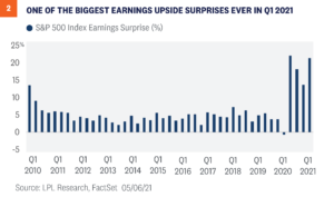 Reopening progress. The biggest earnings upside surprises for the quarter came from consumer discretionary, energy, and financials—all areas of the economy dependent on the reopening. The pace of the reopening appears to have caught analysts and corporate management teams by surprise.