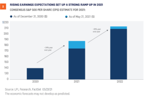 Coming off of a stunning first-quarter earnings season that saw results well ahead of the best-case scenario for nearly all strategists, corporate America is firing on all cylinders. As shown in [Figure 2], not only are earnings expected to ramp up significantly over the remainder of 2021 as the economic rebound continues, but estimates have risen significantly since the start of the year. Reflecting the tremendous strength in corporate profits, our forecast for S&P 500 earnings per share (EPS) in 2021 is $187.50-$190, a 34% increase from 2020, and up from our prior $165 estimate at the start of the year. We believe our estimated range, which is in line with the current consensus estimate, is reasonable given the strong economic growth outlook and massive amount of fiscal stimulus still working its way through the economy. Given the trajectory of economic growth and tremendous momentum exhibited by corporate America during the first quarter, it’s not hard to envision even higher numbers. A significant pickup in inflation could present risk to corporate profit margins. If the labor market tightens in a fully reopened economy, companies may see upward pressure on wages. Supply shortages, higher commodity prices, and rising borrowing costs may also erode profitability of U.S. companies. U.S. businesses are also closely monitoring policy developments, as a potential increase in the corporate tax rate would have an immediate impact on their bottom lines. Meanwhile, some international economies are still struggling to get through the pandemic, which could present a headwind for U.S.-based multinationals.