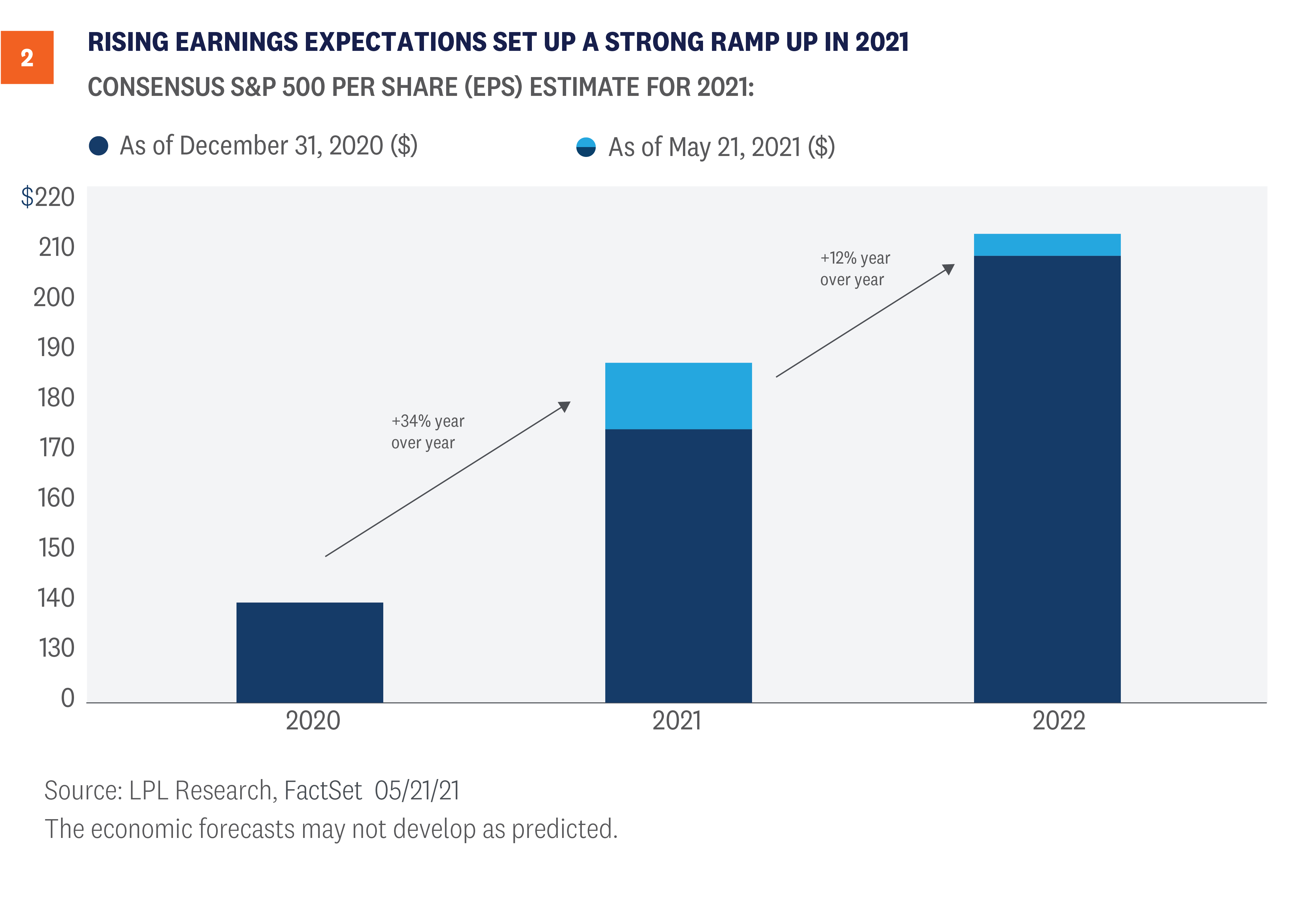 ______________________________________________________________________________________________ IMPORTANT DISCLOSURES This material is for general information only and is not intended to provide specific advice or recommendations for any individual. There is no assurance that the views or strategies discussed are suitable for all investors or will yield positive outcomes. Investing involves risks including possible loss of principal. Any economic forecasts set forth may not develop as predicted and are subject to change. References to markets, asset classes, and sectors are generally regarding the corresponding market index. Indexes are unmanaged statistical composites and cannot be invested into directly. Index performance is not indicative of the performance of any investment and do not reflect fees, expenses, or sales charges. All performance referenced is historical and is no guarantee of future results. Any company names noted herein are for educational purposes only and not an indication of trading intent or a solicitation of their products or services. LPL Financial doesn’t provide research on individual equities. All information is believed to be from reliable sources; however, LPL Financial makes no representation as to its completeness or accuracy. US Treasuries may be considered “safe haven” investments but do carry some degree of risk including interest rate, credit, and market risk. Bonds are subject to market and interest rate risk if sold prior to maturity. Bond values will decline as interest rates rise and bonds are subject to availability and change in price. The Standard & Poor’s 500 Index (S&P500) is a capitalization-weighted index of 500 stocks designed to measure performance of the broad domestic economy through changes in the aggregate market value of 500 stocks representing all major industries. The PE ratio (price-to-earnings ratio) is a measure of the price paid for a share relative to the annual net income or profit earned by the firm per share. It is a financial ratio used for valuation: a higher PE ratio means that investors are paying more for each unit of net income, so the stock is more expensive compared to one with lower PE ratio. Earnings per share (EPS) is the portion of a company’s profit allocated to each outstanding share of common stock. EPS serves as an indicator of a company’s profitability. Earnings per share is generally considered to be the single most important variable in determining a share’s price. It is also a major component used to calculate the price-to-earnings valuation ratio. All index data from FactSet. Please read the full Outlook 2021: Powering Forward publication for additional description and disclosure. This research material has been prepared by LPL Financial LLC. Securities and advisory services offered through LPL Financial (LPL), a registered investment advisor and broker-dealer (member FINRA/SIPC). Insurance products are offered through LPL or its licensed affiliates. To the extent you are receiving investment advice from a separately registered independent investment advisor that is not an LPL affiliate, please note LPL makes no representation with respect to such entity. Not Insured by FDIC/NCUA or Any Other Government Agency | Not Bank/Credit Union Guaranteed | Not Bank/Credit Union Deposits or Obligations | May Lose Value