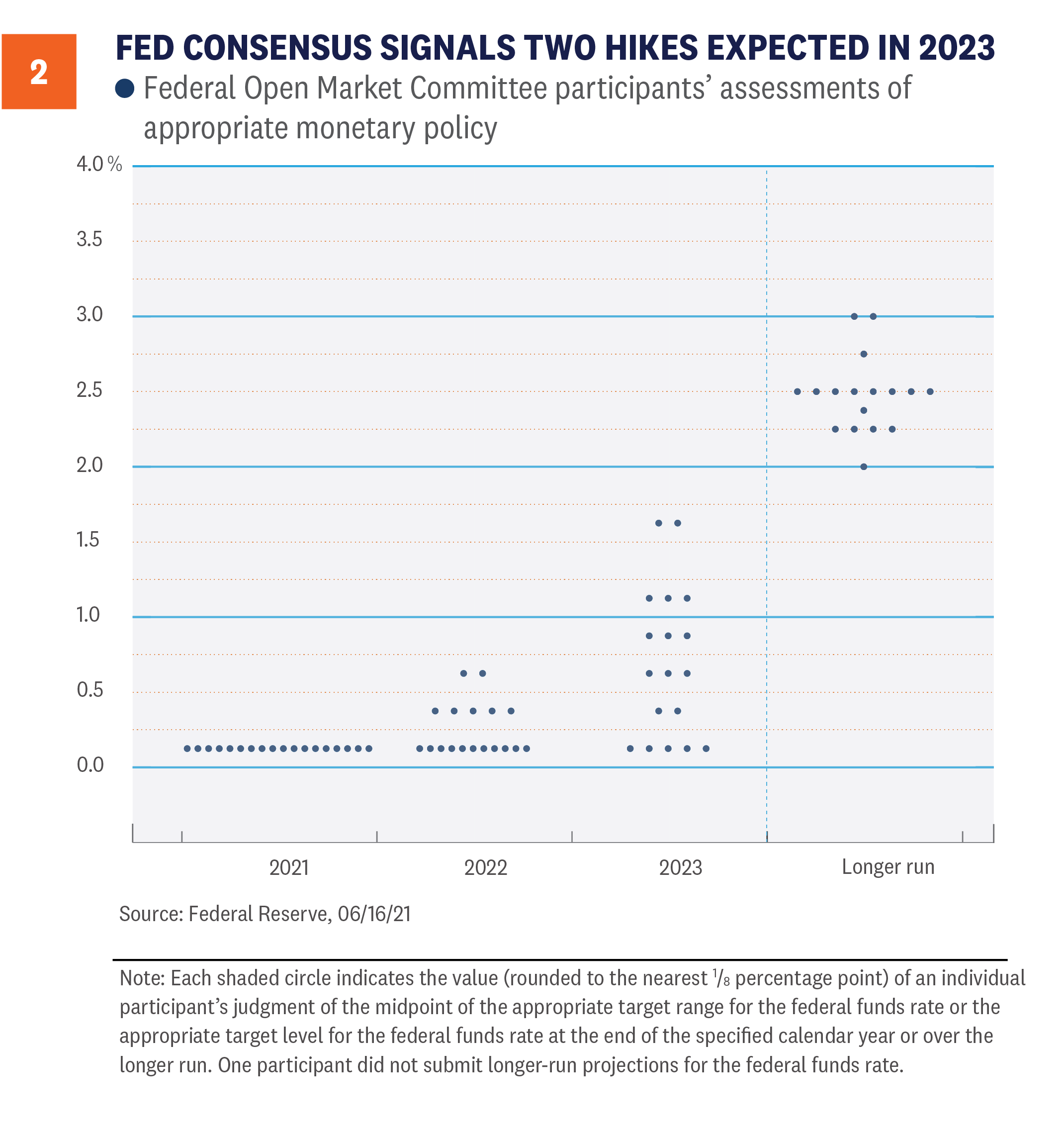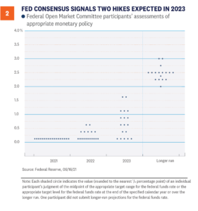 The Fed ended its two-day Federal Open Market Committee (FOMC) meeting last week and, as expected, there were no changes to its current interest-rate or bond-purchasing policies. However, signaling on the future path of short-term interest rates seemingly surprised markets because the number of Fed members who now expect interest-rate hikes in 2023 changed dramatically, relative to the last FOMC release. While an initial rate hike was once thought of as a 2024 event at the earliest, as seen in chart below, the majority of members now expect at least two quarter-point interest-rate hikes to take place in 2023. Additionally, seven members (out of 18) expect at least one rate hike in 2022. These “dot-plot” projections are not voted on—nor do they represent official policy [Figure 2]. But they do show the divergent opinions by some of the committee members. In fact, the market may have interpreted the changing projections as a shift in the way some committee members are interpreting the Fed’s new Average Inflation Target (AIT) mandate. That some members think interest rates should move higher next year is a notable difference from what some Fed members have repeatedly said: that they want inflation to run above 2% for some time before they raise interest rates.