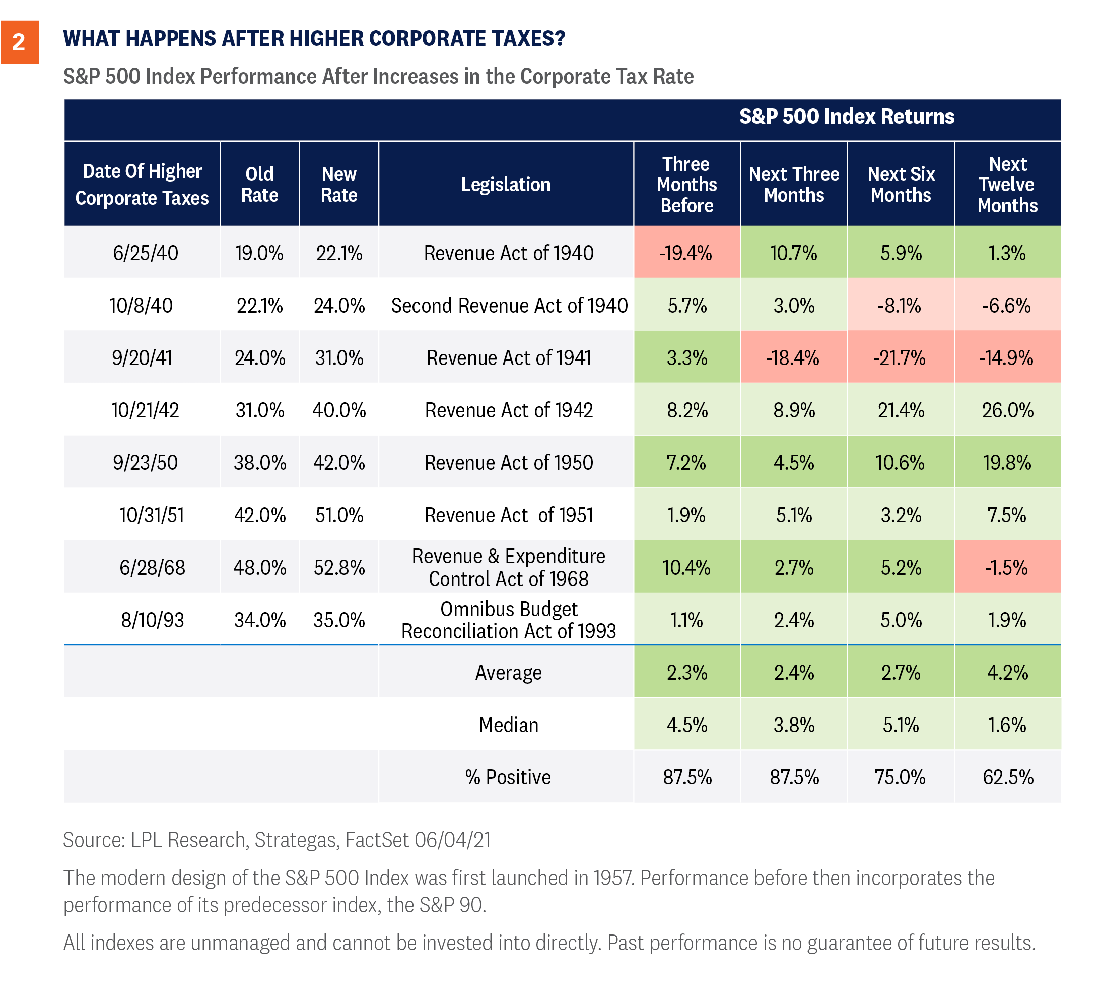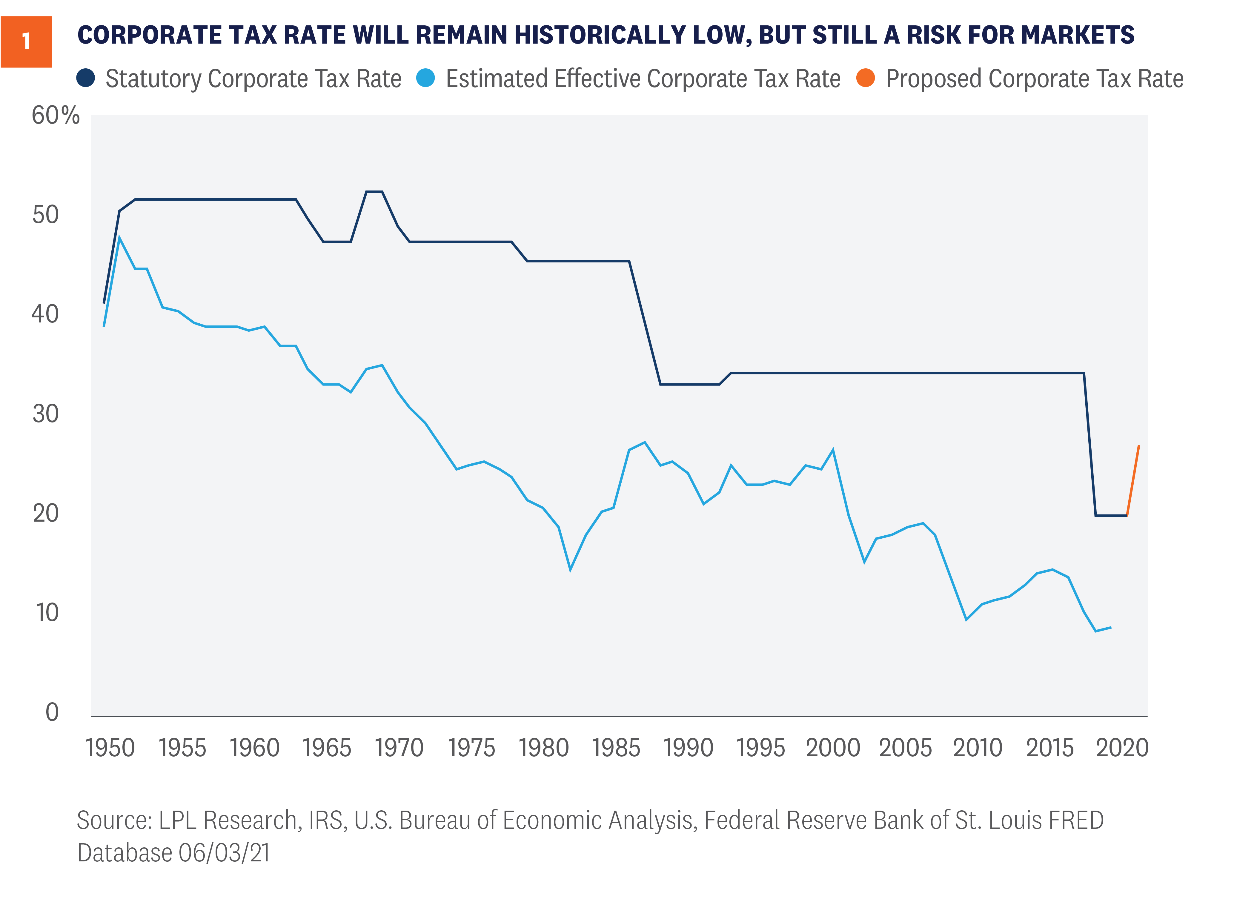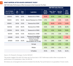 Federal spending is generally funded by taxes or debt, and the Biden administration plans to raise taxes to help pay for BBB. President Biden has proposed increasing taxes on both corporations and wealthy households, including an increase in the capital gains tax, the tax on investment profits. Markets so far have taken the proposed changes in stride, largely due to expectations that the proposed tax increases will be reduced during negotiations and the economy will be strong enough to absorb the impact. The Tax Cuts and Jobs Act (TCJA), signed into law by President Trump in December 2017, reduced the top tax rate on corporations from 35%, where it had been since 1993, to 21%. Before the TCJA, the top U.S. statutory corporate tax rate had not been under 30% since the 1940s. There were also other structural reforms in the TCJA, including changes to the way U.S. corporate profits from abroad are taxed, in an attempt to make U.S. companies more competitive. President Biden has proposed increasing the corporate tax rate to 28%, but that should be viewed as a bargaining position and we believe the more likely outcome is that we see the rate end up closer to 25%. Alternative approaches, such as increasing the minimum tax on businesses and raising the top rate less—or not at all, are becoming part of the conversation. The negative news for markets is that corporate earnings growth will likely take a direct hit that is approximately equal to the size of any tax hike. Because the stock market is fundamentally driven by earnings growth, the tax impact will likely be a headwind for equity markets. On the positive side, this move has been anticipated for quite some time and should not be much of a surprise to markets. Further, as shown in [Figure 1], excluding the TCJA rate, this will still be the lowest tax rate in about 70 years and the effective tax rate has also declined. While the general direction of corporate tax rates has been lower for most of the last 70 years, how has the market been impacted when we have had tax increases? As shown in [Figure 2], markets historically have absorbed higher corporate tax rates, although with below-average returns. While we don’t think higher rates would be retroactive, they could take away some of the momentum from recent upside surprises in earnings growth we’ve seen so far in 2021 and contribute to a choppier market. Proposed tax provisions to raise funds for BBB on the household side include increasing the top tax rate on ordinary income from 37% to 39.6%, and raising the capital gains and dividends taxes on those who earn more than $1 million to a maximum of 43.4% from the current 23.8%—a stunning increase if fully instituted. At the same time, only 0.32% of the population makes more than $1 million a year, so the truth is this won’t impact the other 99.68% of the population. Looking at history, capital gains taxes did increase in 1986 and 2013, but the economy was on firm footing and the S&P 500 produced gains of more than 9% and 25%, respectively, over the following twelve months. On the other hand, the S&P 500 declined in the twelve months following capital gains increases in 1969 and 1976, which saw an economy marred by higher inflation and sluggish growth. Is it as simple as how the economy is doing? Policy matters, but broader economic trends matter more. If we see a capital gains tax increase, we do expect some investors may rotate out of equities and seek more tax-friendly opportunities, but that would have to be balanced against the decision to accelerate capital gains. Long-term investors may simply wait out the new rate on expectations that it may be changed again by a subsequent administration.
