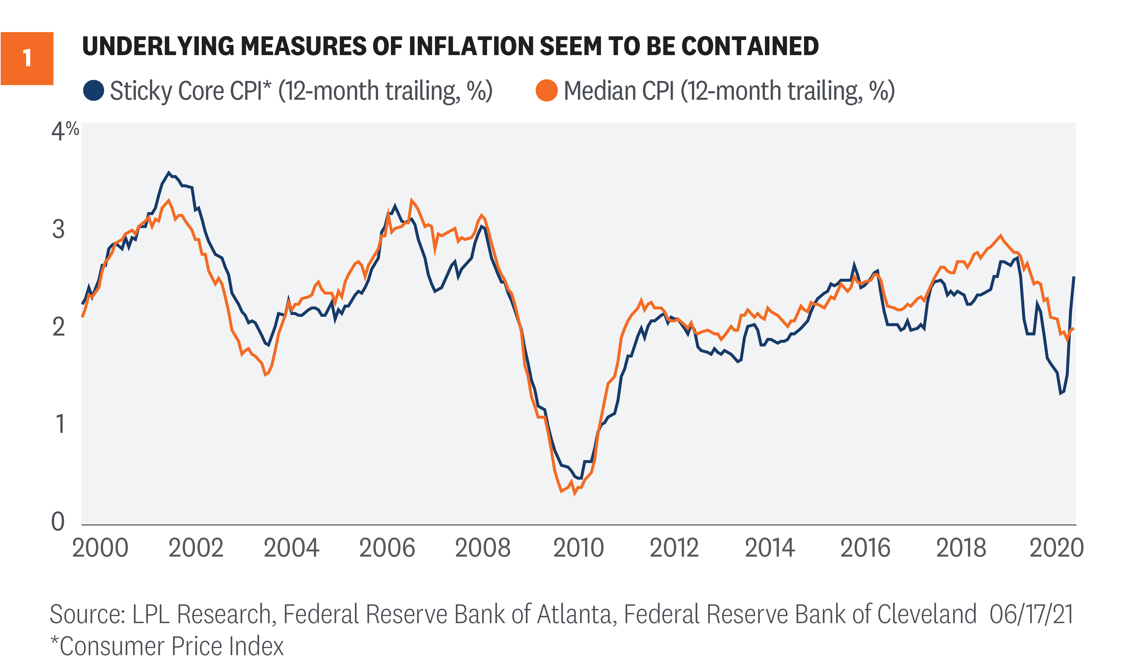 Inflation has been on the rise. Investors are not as interested in what’s happening now as they are in what’s happening next. Meanwhile, the Federal Reserve (Fed) shared its views at the conclusion of its last policy meeting on Wednesday, June 16. And while the Fed’s position that inflation is likely to be transitory has become stronger, not weaker, Fed members have seemingly different opinions on the future path of monetary support. Inflation has been on the rise. Everyone knows it and feels the impact with every purchase. The Consumer Price Index (CPI) spiked to 5.0% year over year in May, the most since 2008, while core CPI (excluding food energy) hit 3.8%, the highest since 1992. Inflation has been rising and the Fed is watching. How will markets react to any potential inflation over the next year? We do know this: Markets will be looking forward, not backward. By the time something becomes a “thing,” a meme, or makes a magazine cover, market participants are often past it, as we discussed in our June 16 blog, Why Inflation Worries Likely Just Peaked. Markets are no longer watching to see if inflation will spike. It already has. In fact, since the big upside surprise in the April inflation data, released May 12, many inflation-sensitive assets have been underperforming. Copper? Down. Lumber? Down. The 10-year Treasury yield? Down. Market-implied inflation rates? Down. Gold? Down. At the conclusion of its last policy meeting on June 16, the Fed shared its view on what may be coming for inflation. In its updated forecasts, the Fed acknowledged it had missed on inflation expectations, upgrading its preferred core inflation forecast for 2021 from 2.2% all the way up to 3.0%. That’s a large jump, but that’s based on what’s behind us. The forecast for the same index in 2022 and 2023 scarcely moved, at 2.1% for both years. Inflation is certainly still capable of coming in hotter than expected. The difference between now and earlier this year is that inflation expectations are already elevated. In order to see inflation assets really perk back up, we would probably need to see stronger signs that higher inflation may be persistent. To get a read on that, it may be better to look at prices that tend to be more stable. We know there are areas where we’re seeing extreme price moves, which is impacting broader measures of inflation. But what about prices that tend not to move? There is such a measure, developed by the Federal Reserve Bank of Atlanta, called sticky core inflation. As seen in [Figure 1], unlike CPI and even core CPI, sticky core prices are not setting multi-decade or multi-year highs. Sticky core CPI is up 2.6% year over year. The last time it was that high was…2020. There are still some warning signs though. While you have to be careful annualizing monthly data because it multiplies small, potentially meaningless, moves, annualized sticky CPI in each of the last two months was over 4% and that hasn’t happened since 1992. But even sticky core CPI has had some price idiosyncrasies in the current environment. If you take just the median move of the CPI components, the middle change for any given month, 12-month price changes have actually been declining. And the last two months? Somewhat elevated but nothing special.