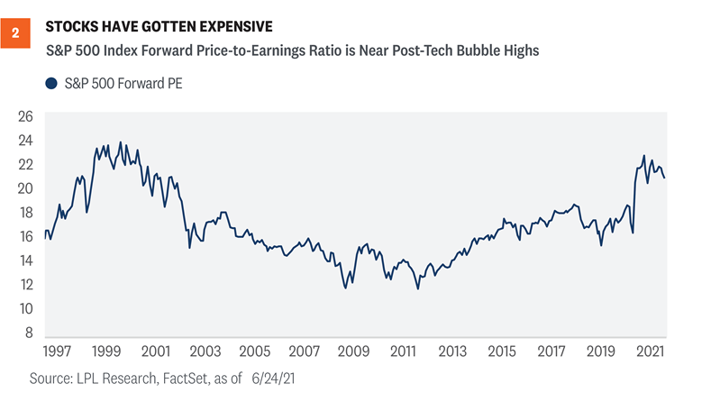 Strong earnings growth is helping stocks grow into elevated valuations. However, based on the most commonly used valuation metrics such as the price-to-earnings ratio (P/E), stock market valuations are still elevated. The S&P 500 Index is trading at a forward P/E of 21 times the consensus earnings estimate for the next 12 months, several points above the post-1980 average of 17 (source: FactSet). By that measure, a lot of good news is priced in. But we would not evaluate stock valuations in a vacuum. Fundamentally, stock valuations represent the present value of future earnings. When we calculate today’s value of future profits, interest rates come into play. When incorporating interest rates into valuation analysis, we find stocks are actually quite reasonably priced. Based on 2021 forecasts relative to their prices, S&P 500 earnings are about three percentage points cheaper than the 10-year Treasury “earnings,” which is their yield. The long-term average of this “equity risk premium” is about 0.8%, indicating stocks are cheaper than bonds, as we discussed in our April 26, 2021 Weekly Market Commentary. If inflation risk remains manageable throughout the second half of the year and yields rise only gradually, we would anticipate that earnings growth would continue to support market gains.