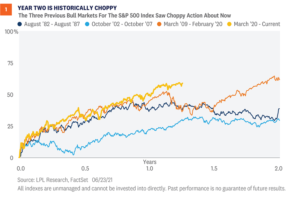 The good news is the second year of every single bull market since World War II has seen the S&P 500 climb higher. That is 12 for 12 for year two gains. The second year for this bull market started on March 23, 2021, and so far, stocks are off to a solid start—up more than 9%. The bad news is for many of the past bull markets, year-two gains were quite muted, as stocks caught their breath from the year-one sprint. With the S&P 500 up more than 90% from the March 23, 2020 lows, we wouldn’t be surprised at all if history repeated and stocks saw choppier action in year two. In fact, taking a closer look at the most recent bull markets it’s clear that a choppy and frustrating path is perfectly normal in year two [Figure 1].