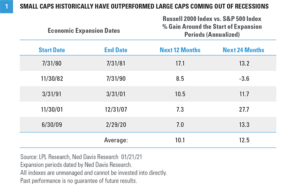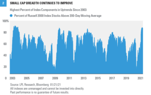 Performance has not be limited to the index level, either. Breadth continues to improve for small caps. (Breadth is the percentage of stocks in the category participating in the market.) The percent of index constituents trading above their 200-day moving average has surged to over 89%, the highest level since 2004. Not only is strong breadth a hallmark of a healthy market, but the levels of participation we are seeing now tend to be found almost exclusively at the beginning of bull markets, not the end. The election outcome, stimulus prospects, and progress toward fully reopening the economy as COVID-19 vaccines are distributed have triggered a leadership change from large caps to small caps. However, it has not triggered the sort of style rotation we have seen within the large cap space. Even as large cap value has outperformed large cap growth by more than 5 percentage points over the past three months, small cap growth and small cap value performance have been equally stellar, with both the Russell 2000 Growth and Russell 2000 Value indexes returning 34%.