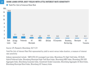 You may be surprised to see banks on here as another income idea. The financials sector, which we upgraded in our January Global Portfolio Strategy report, carries a dividend yield of 1.9%, but banks yield 2.6%, based on the S&P 500 Bank Index. Although plenty of bond strategies carry yields in that range or higher, banks do not bring the interest rate risk that bonds do. Historically, bank stocks have exhibited positive correlation to interest rates (the stocks have tended to outperform as yields have risen). Bank stocks also tend to like a steepening yield curve—long-term interest rates rise faster than short-term rates—which we expect to see over the balance of 2021 as the economic recovery gains steam. We also expect bank dividend payouts to rise over the next year or two as the Federal Reserve eases up on payout restrictions. More progress on vaccine distribution should also enable a fully re-opened economy and drive stronger economic growth, which should bode well for the profitability and, therefore, dividend payout potential for the financials sector. Yields from banks may not look great on the surface—certainly not compared to the energy sector or some of the higher yielding segments of the bond market. But in a low rate environment with rates more likely to rise than fall, in our view, we think banks can make sense for income oriented investors with an eye toward total return.Income Idea #3: Bank Loans