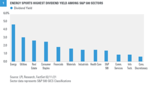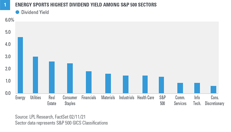 The first idea is energy stocks. You may be surprised to learn that the energy sector currently yields about 5% based on dividends paid in 2020, topping all S&P 500 sectors [FIGURE 1]. In this month’s Global Portfolio Strategy report, we upgraded our view of the energy sector to neutral. Our increased optimism was driven primarily by three factors. First, as we get closer to a fully reopened economy and travel activity picks up—potentially in the second half of this year—energy is likely to be a big beneficiary. Second, our technical analysis work revealed attractive upside potential based on recent price appreciation after an extended period of weakness. Third, we see the sector as attractively valued, especially when considering the income potential. Keep in mind that dividends can be cut, so this investment is not without risk. Oil prices can be volatile, and alternative energy is gaining market share. So this may be more of a medium-term trade than a long-term investment. That said, we believe the chances are good that oil prices at least hold steady in the $55--60 per barrel range this year, sufficient for the sector to maintain rich yields while potentially seeing some additional price appreciation—on top of the 17% year-to-date gain.Income Idea #2: Banks