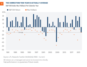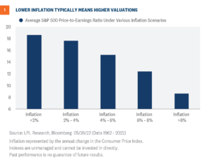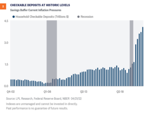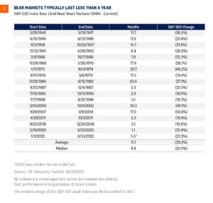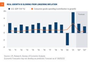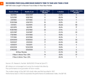 Looking back at bear markets throughout history, a key determining factor of where the declines ended has been whether the U.S. economy goes into recession. With a recession, bear market declines have averaged 35%. Without, they’ve averaged 24%, close to where the S&P 500 is now. LPL Research puts roughly 50% odds of recession in the next 12 to 18 months, and sees a mild recession if we get one, while the market has already priced in about a 70% chance of recession. As a result, the LPL Research Strategic and Tactical Asset Allocation Committee remains comfortable with 62% equities for the typical 60/40 portfolio and is considering adding to equities on weakness.