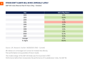 “Sell in May and go away” began in England originally as “sell in May and go away until St. Leger’s Day.” The saying was based around the St. Leger Stakes, a popular horse race in September that marked the end of summer and a return of the big traders and market volume. As [Figure 1] shows, since 1950 the S&P 500 Index has gained 1.8% on average during these six months, compared with 7.1% during the November to April period. In fact, out of all six-month combinations, the May through October period has produced the weakest—and least positive—average return. But as with many things in life, it is never that simple.