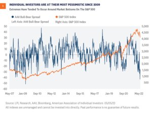 1) AAII Investor Sentiment Survey. The individual investors surveyed weekly by the American Association of Individual Investors (AAII) have displayed extreme levels of pessimism in recent weeks. The readings in April included the lowest number of bullish investors in almost 30 years (15.8% on April 14) and the highest number of bearish investors since 2009 (59.4% on April 28). As shown in Figure 1, the spread between the number of investors who are bullish and those who are bearish has recently reached extreme levels not seen since 2009.