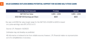 How have they done it? Primarily through pricing power that has boosted revenue. The consensus estimate for revenue this year has increased 4.2% year to date. It hasn’t been difficult to sell customers on the idea of paying higher prices in this environment when higher costs are affecting everyone. The good news is higher wages and pandemic savings have helped consumers afford those prices. Companies have also managed higher costs efficiently, in many cases doing more with less. That narrative certainly fits the energy sector which is also enjoying a revenue windfall. Energy sector employment has fallen significantly over the past couple of years, according to Bureau of Labor Statistics data. National employment is still below pre-pandemic levels, yet trailing 12 month S&P 500 revenue is up 12%. Bottom line, we recognize our $220 per share forecast for 2022 S&P 500 earnings is probably too low and that number probably comes in closer to $225, up 8% year over year.
