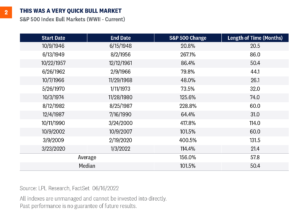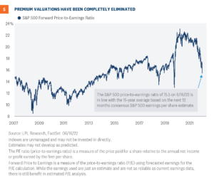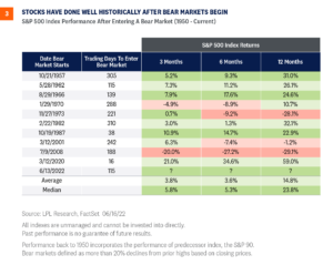 We are considering adding to our equities allocation but are waiting for either more evidence that inflation is coming down or for technical analysis signals that have often accompanied major market lows. We would not be surprised by a retest of recent lows in the short term, but for suitable long-term investors, this could be a good entry point. Those more defensively positioned may want to consider nibbling here. Those with higher risk tolerances may consider adding at the next dip. Jeff Buchbinder, CFA, Equity Strategist, LPL Financial Ryan Detrick, CMT, Chief Market Strategist, LPL Financial ______________________________________________________________________________________________ IMPORTANT DISCLOSURES This material is for general information only and is not intended to provide specific advice or recommendations for any individual. There is no assurance that the views or strategies discussed are suitable for all investors or will yield positive outcomes. Investing involves risks including possible loss of principal. Any economic forecasts set forth may not develop as predicted and are subject to change. References to markets, asset classes, and sectors are generally regarding the corresponding market index. Indexes are unmanaged statistical composites and cannot be invested into directly. Index performance is not indicative of the performance of any investment and does not reflect fees, expenses, or sales charges. All performance referenced is historical and is no guarantee of future results. Any company names noted herein are for educational purposes only and not an indication of trading intent or a solicitation of their products or services. LPL Financial doesn’t provide research on individual equities. All information is believed to be from reliable sources; however, LPL Financial makes no representation as to its completeness or accuracy. U.S. Treasuries may be considered “safe haven” investments but do carry some degree of risk including interest rate, credit, and market risk. Bonds are subject to market and interest rate risk if sold prior to maturity. Bond values will decline as interest rates rise and bonds are subject to availability and change in price. The Standard & Poor’s 500 Index (S&P500) is a capitalization-weighted index of 500 stocks designed to measure performance of the broad domestic economy through changes in the aggregate market value of 500 stocks representing all major industries. The PE ratio (price-to-earnings ratio) is a measure of the price paid for a share relative to the annual net income or profit earned by the firm per share. It is a financial ratio used for valuation: a higher PE ratio means that investors are paying more for each unit of net income, so the stock is more expensive compared to one with lower PE ratio. Earnings per share (EPS) is the portion of a company’s profit allocated to each outstanding share of common stock. EPS serves as an indicator of a company’s profitability. Earnings per share is generally considered to be the single most important variable in determining a share’s price. It is also a major component used to calculate the price-to-earnings valuation ratio. The PCE Price Index Excluding Food and Energy, also known as the core PCE price index, is released monthly. The core index makes it easier to see the underlying inflation trend by excluding two categories – food and energy. – where prices tend to swing up and down more dramatically and more often than other prices. The Consumer Price Index (CPI) is a measure of the average change over time in the prices paid by urban consumers for a market basket of consumer goods and services. All index data from FactSet. This research material has been prepared by LPL Financial LLC. Securities and advisory services offered through LPL Financial (LPL), a registered inv estment advisor and broker -dealer (member FINRA/SIPC). Insurance products are offered through LPL or its licensed affiliates. To the extent you are receiving investment a dvice from a separately registered independent investment advisor that is not an LPL affiliate, please note LPL makes no representation with respect to such entity. Not Insured by FDIC/NCUA or Any Other Government Agency | Not Bank/Credit Union Guaranteed | Not Bank/Credit Union Deposits or Obligations | May Lose Value