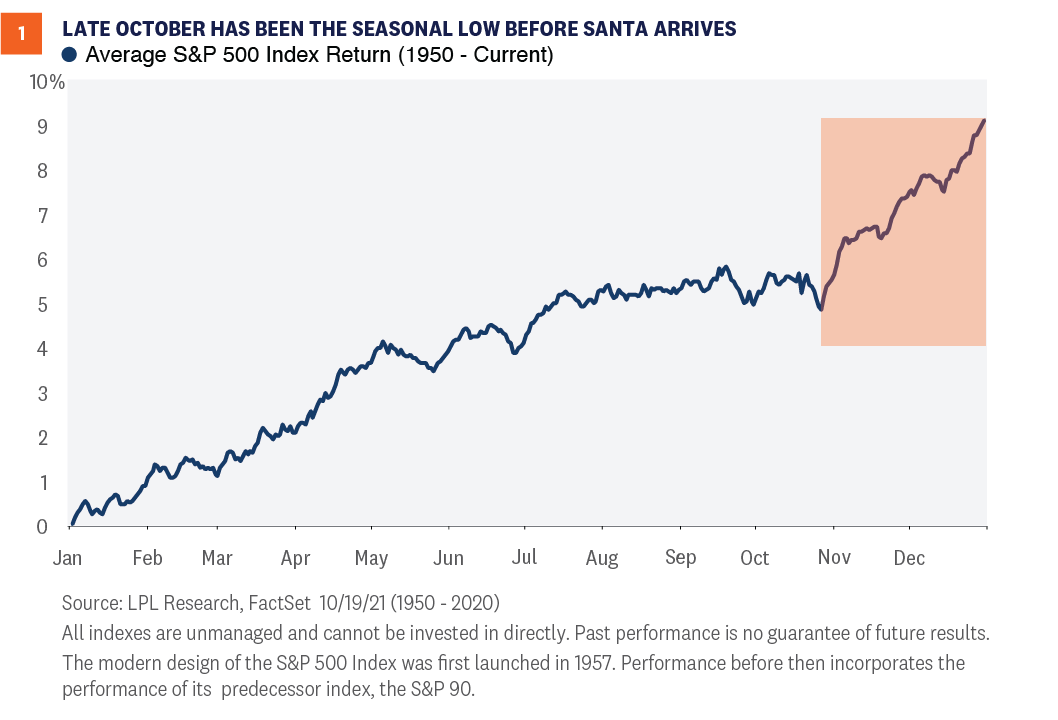 One of the most important points we believe investors should recognize is that there has been a sort of stealth correction going on throughout most of the summer, consistent with the historically weak period commonly referred to as “Sell in May and Go Away.” While the S&P 500 has returned more than 8% since the end of April, the average individual stock in the index suffered more than a 10% correction. Meanwhile, the average stock in the Russell 2000 Index (covering small cap equities), which is almost unchanged over that period, suffered a more than 25% bear market. However, as shown in [Figure 1], late October has historically marked the seasonal low before stocks typically rally into year-end. In fact, the fourth quarter as a whole is by far the strongest quarter historically, on average, with the S&P 500 rising 4% and finishing higher nearly 80% of the time. November, meanwhile, is the strongest month of the year—both since 1950 and over the past decade. So, whether you believe that stocks have thus far followed the historical pattern of summer weakness that should be ending, or that the current price trend is so strong that it was able to buck the summer doldrums, we see ample reason to believe that seasonality has now turned from a headwind for equities to a tailwind.