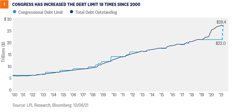 Last week, Congress was able to push back a fast-approaching deadline for raising the debt ceiling to December. Markets applauded the move with a relief rally. Despite decreased uncertainty in the near term, we may be confronted with the same problem again in a couple of months. This week we look more closely at the role the debt ceiling plays in government financing, what could happen if the debt ceiling is not raised in a timely way, and why market participants were skittish about the approaching deadline as we look ahead to December. Democrats and Republicans struck a deal last week to raise the debt ceiling, prompting a relief rally in equity markets. While failing to raise the debt ceiling was extremely unlikely, if it had happened it could have potentially done considerable damage to markets and the economy. But even approaching the deadline when the government would no longer be able to meet its obligations was having an impact. The mere appearance of Democrats and Republicans playing politics with the deadline was weighing on markets and forcing businesses to prepare for the very unlikely, but still possible, outcome of a government default. Unfortunately, we may have to do this all over again in December, and Congress does not yet seem to have fully learned from the 2011 debt-ceiling debacle that this issue is not to be taken lightly. Even if the current solution is just kicking the can for a couple of months, it does remove the immediate danger and opens up additional paths to address the problem well before the next deadline. The important debt-ceiling debate will continue, although with a reduced sense of urgency in the near term. In this Weekly Market Commentary, we take a closer look at the debt ceiling and the potential consequences of failing to raise it. 13 Questions Answered About the U.S. Debt Ceiling