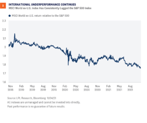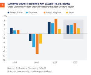 If developed international market equities are going to outperform, we’re probably getting close to the point in time where we start to see it. Markets may be on the cusp of another rotation to value as global growth picks up, while economic growth in Europe, the majority of the MSCI EAFE Index, may exceed that of the U.S. next year. However, we still favor the U.S. over developed international markets as we enter 2022—primarily due to technical factors, including the weak momentum for the major stock indexes outside the U.S., the strong U.S. dollar, and continued strength in U.S. growth stocks, which makes it hard for the more value-oriented markets in Europe and Japan to keep up. For developed international markets, neither economic growth nor earnings stand out relative to the U.S., so sticking with what’s been working makes sense. Finally, our emerging markets equities recommendation remains negative due to ongoing regulatory risks in China, which could slow the growth of the Chinese economy and earnings, while also increasing uncertainty. Jeffrey Buchbinder, CFA, Equity Strategist, LPL Financial
