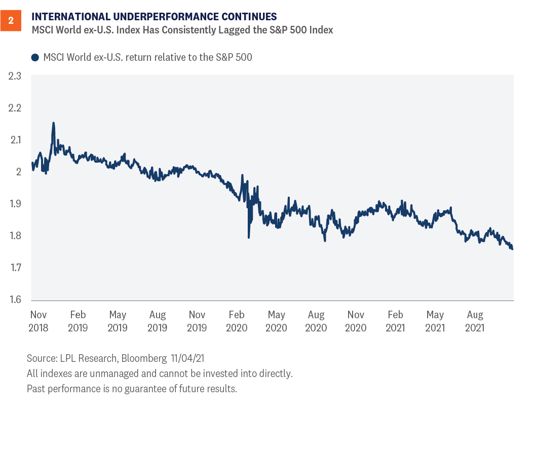 It’s been difficult to find a macroeconomic story that supports reducing exposure to U.S. equities in favor of their developed international counterparts. But frankly, if one is going to develop, it may need to happen soon. As COVID-19 cases have fallen globally in recent months, it sets up a potentially synchronized global expansion in 2022. If that global expansion is accompanied by a weaker U.S. dollar and value stocks can at least hold their own, then we think developed international equities could be in a fairly good position to potentially outperform U.S. equities. As shown in Figure 1, the consensus forecasts for gross domestic product (GDP) growth in 2022 are calling for the European economies (the Eurozone and the United Kingdom) to grow faster than the United States next year. Europe and Japan are both ahead of the United States right now in vaccinations administered as a percentage of their populations (source: Ourworldindata.org), after playing some catch-up, which positions those economies to take the next step forward in their recoveries. Europe and Japan are also earlier in their economic cycles, leaving more upside in terms of growth potential. Forecasts for economic growth in Europe do look a bit better on a relative basis next year, and economic growth expectations for the second half of 2021 have held up relatively well recently despite the COVID-19 Delta variant wave, based on Bloomberg’s consensus GDP forecasts. However, Europe’s economic momentum may be peaking based on purchasing managers’ index data. Moreover, the Citi Economic Surprise Index for Europe stands at -51.5, compared to the one-year average of +90. In other words, European economic data has been mostly falling short of expectations and even missing more frequently than the U.S., where the surprise index reading is -20.5. Japan’s surprise index is also weak at -79. With solid economic growth expected in Europe, perhaps even slightly better than in the U.S., a neutral view (or market weight) has solid support. But with momentum in Europe likely past its peak and growth in Japan lagging behind, the case for a more positive view of international equities is not particularly compelling.