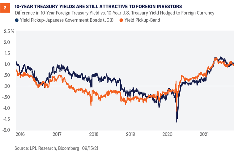 Another key reason we believe interest rates have not moved much higher this year is foreign investors’ interest in the U.S. Treasury markets. Global interest rates remain low by historical standards and compared to U.S. Treasury yields. In fact, a number of countries have 10-year Treasury yields close to 0.0% or even negative in certain countries. Aging demographics and strong social support programs have made many Japanese and European investors look outside of their home countries to help fund underfunded pension schemes. Currently, there remains nearly $15 trillion in negative-yielding debt globally, which makes the 1.33% 10-year Treasury yield (as of September 16) look extremely attractive. Moreover, when investing in U.S. markets, foreign investors have to be mindful of the currency risk associated with U.S. investments. Because foreign investors’ liabilities are denominated in their home currency, most foreign investors hedge out the dollar risk embedded within U.S. investments. There is a cost to hedging out that risk though, which limits the attractiveness of those cross-border investments. But as shown in Figure 2, even after considering those costs the yield pickup relative to Japanese government bonds (JGB) and/or German bunds can be substantial. Japanese and German/European investors in particular can earn an additional 1% per year by investing in U.S. Treasuries. While that may not sound like much, the alternative for many German/European investors is to pay the government 0.30% per year for 10 years for the right to own that debt. In this low-rate environment, any incremental yield pickup is welcome. As the Fed starts to raise short-term interest rates—likely in 2023—the costs to hedge the currency risk increases. But until then, the incentive for cross-border investment remains, which will likely constrain the amount of upside we will see in long-term U.S. yields through the end of 2021.