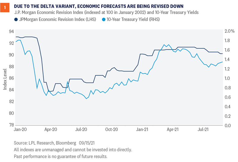 A key variable in determining the direction and level of interest rates is the expected growth rate of the economy. With everything else being equal, if the gross domestic product (GDP) growth rate is expected to increase, long-term Treasury yields tend to increase as well. The reverse is also generally true. Going into the COVID-19 lockdowns, we saw both growth expectations and 10-year Treasury yields fall significantly. However, as seen in Figure 1, after the successful development of the COVID-19 vaccines in early January, GDP growth expectations were generally revised higher (JPMorgan’s Economic Revision Index rises as economists’ expectations for economic growth improve). As such, long-term interest rates generally moved higher as well. However, due to the persistence of the Delta variant, we are starting to see GDP growth forecasts revised lower. That has kept interest rates relatively anchored at current levels. We think any potential slowdown in growth will be temporary, with future growth expectations eventually rising as the impact of the Delta variant wanes and the economy bounces back again, which we think will likely take place over the next six to 12 months. Until then though, long-term interest rates may have difficulty moving significantly higher from current levels.